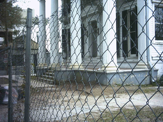 The Front Yard of the Belfort Mansion through the Front Gate in 3/2004. A new sidewalk had been poured which connects the Front Gate to the front steps of the Mansion and the new Driveway on the northeast side of the Mansion.