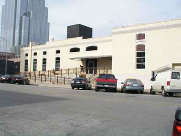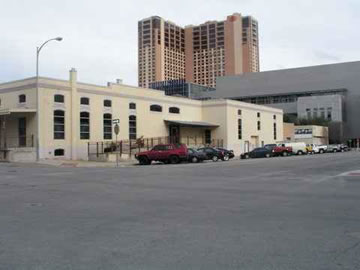 The Front of the Austin Warehouse from the southwest corner of East 3rd Street and San Jacinto Boulevard prior to the renovations for the filming of the series. In this picture, you can see the Rear Warehouse Building on the southeast corner the property. The Austin Convention Center and Hilton are visible in the background.