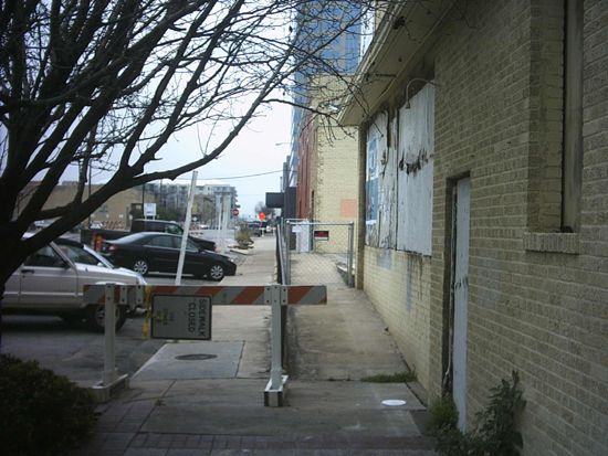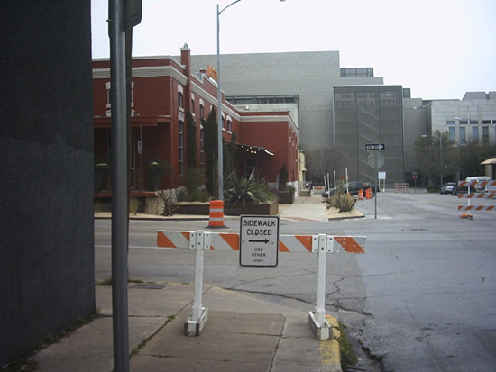 The East 3rd Street Sidewalk of the Austin Warehouse on 3/5/2005. This picture was taken from the northwest corner of East 3rd Street and San Jacinto Boulevard. In this picture, you can see that the Sidewalk had been barricaded with a "Sidewalk Closed" sign to prevent anyone from walking in front of the Warehouse.