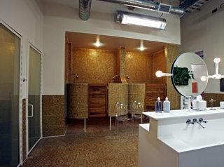 "Walking into the bathroom is like stepping into a stable. A trough sink is mounted in the center of the room with multiple faucets. Swinging saloon-style doors hang outside the shareable dual-head showers. It's a way for all of them to get ready at once, said designer Joel Mozersky. The only thing separating the commodes from the rest of the bathroom (and the cameras) are see-through doors which become instantly opaque at the flip of a switch. The doors are made of electrochromic glass, which can change color when exposed to electricity." (Texas kitsch helps give personality to TV house - www.IndyStar.com)
