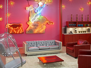 "A sleek vintage vinyl couch, lava stone coffee table and mod seats adorn the small living room area. Two plastic bubble chairs hang above a white flokati shag rug. I used the bubble chairs because I think they're a really fun chair, said designer Joel Mozersky. They can hold like two people. I don't know the exact weight requirement, but they can hold at least 300 pounds." (Texas kitsch helps give personality to TV house - www.IndyStar.com)