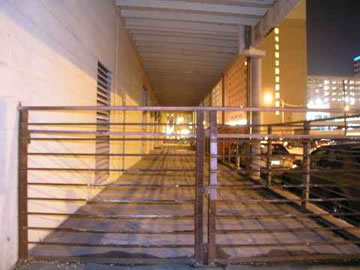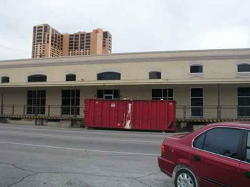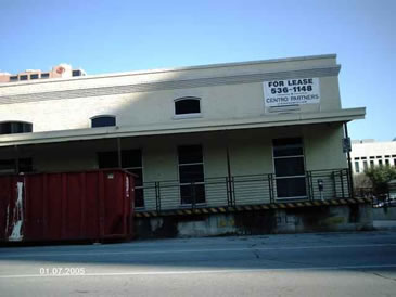 The Loading Dock at the southwest corner of the Austin Warehouse prior to the renovations for the filming of the series. The Loading Dock runs the entire length of the Warehouse on San Jacinto Boulevard. In this picture, you can see the "For Lease" sign on the corner of the Warehouse. Centro Partners had the lease listing on both the Austin Warehouse and the Rear Warehouse Building prior to the filming of the series.