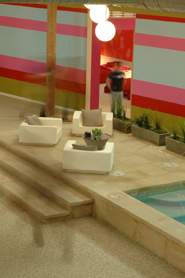 "There's a small pool in the center of the warehouse, carved out of indigenous leuter stone. I didn't know if it was going to be possible due to physics and things like that, said designer Joel Mozersky. We had to build up from the basement. I wanted it to be sort of monolithic like it grew out of the floor, almost like it was always here. The roomies can't even escape from the cameras while dipping in the pool: A camera is hidden below one of the jets. It's more geared toward young adults getting together than anybody doing laps, added Mozersky." (Texas kitsch helps give personality to TV house - www.IndyStar.com)