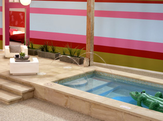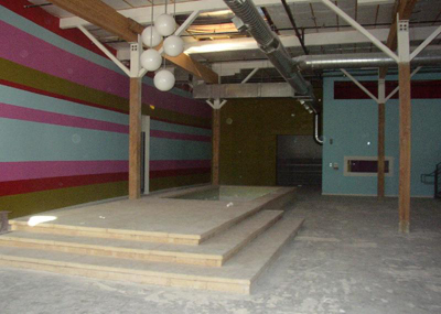 The Pool in the Austin Warehouse after the filming of the series had ended. This picture was taken from the Dining Room looking towards the Game Room and Phone Room. The only items remaining from the filming of the series were the Pool, globe lights, painted walls and the hole in the Phone Room wall where the fish tank was located.