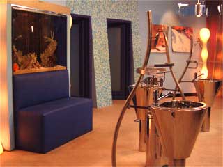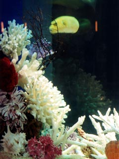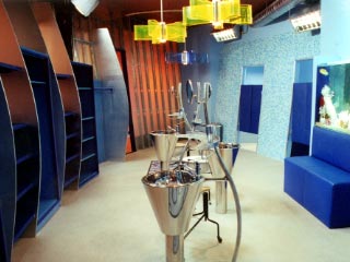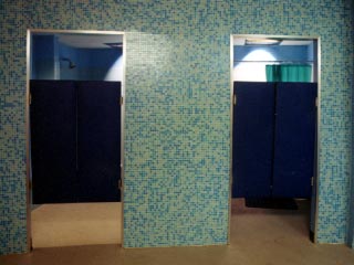 The showers were located to the left of the fish tank. The elevator passed behind the fish tank, but did not stop on the 2nd floor.