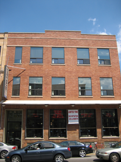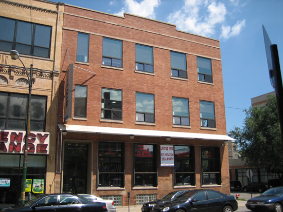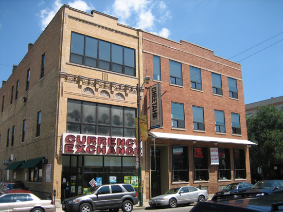 The Front of the Wicker Park Loft and the adjoining Currency Exchange building on 8/4/2006 from across W. North Avenue.