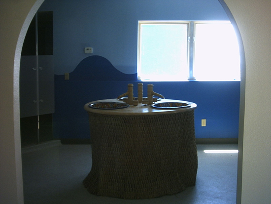 The entrance to the Washroom from next to the Kitchen counter. In this picture, you can see that the fish tanks built into the walls had been removed.