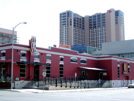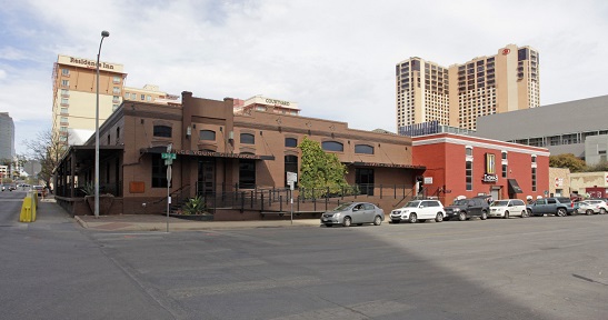 The Front of the Vince Young Steakhouse from the intersection of East 3rd street and San Jacinto Boulevard.
