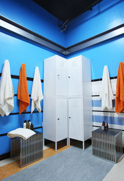 A set of lockers across from the showers. There were additional lockers next to the sinks.