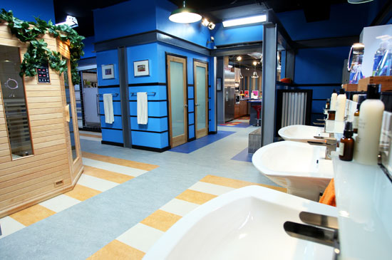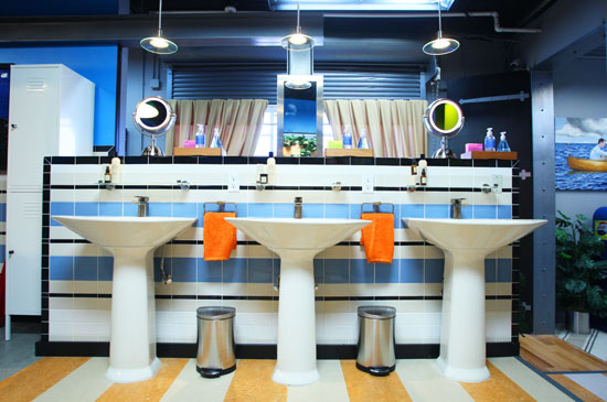 The sinks were located across from the sauna.
