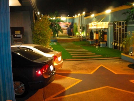 The Columbia Square Studios Yard in May 2010 after the building had been returned to its original condition. In this picture, you can see that the building's color scheme has been slightly changed and the mural behind the Pool removed for the filming of Confessions of a Teen Idol. The marquee above the Front Door has also been removed but the Pool remains. Along the left side of this picture, you can see the areas that were the Garage, Gym, Basketball Court, Outdoor Bar and Billiard Room during the filming of the series.