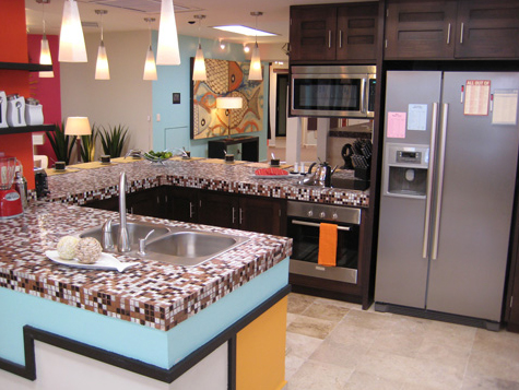 "The Living Room seamlessly transitions into an open-plan, extra large kitchen surrounded by windows on all sides for unobstructed views of the ocean. The fully equipped kitchen comes complete with a refrigerator, full range stove with oven, microwave, coffee maker and all the cooking utensils necessary to entertain and create a perfect dining experience. The oversized mosaic countertop is ideal for serving buffets or blending margaritas while guests hang-out on eight red, leather bar stools." (ME Cancun Debuts 'SuiteME' - www.cnbc.com)