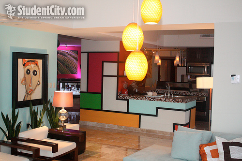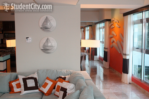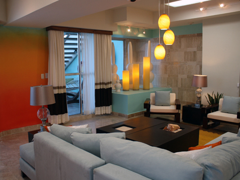 "Adjacent to the 'Serene Balcony', guests will find a cozy Living Room space. Sumptuous couches entice guests to relax while a coffee table with built-in sand boxes brings the beach inside. The walls of the Living Room gradually change from a vibrant red, to orange, to yellow mimicking Cancun's famous sunsets. All SuiteME spaces were built with an openness and airy ambiance in mind." (ME Cancun Debuts 'SuiteME' - www.cnbc.com)
