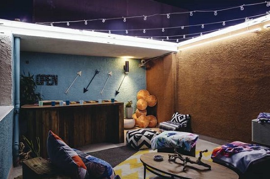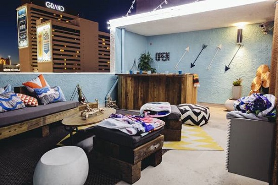 The Blue Patio of the Gold Spike Penthouse Suite was located in the southwest corner of the 7th floor. In this picture, you can see the Downtown Grand Hotel & Casino in the background.