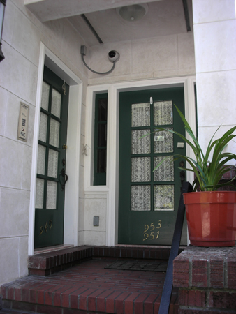 The Front Doors of the Lombard Street House on 9/7/2006. In this picture, you can see the security camera above the Doors.