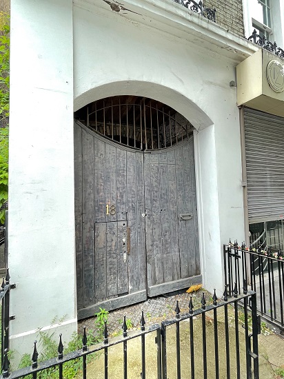 The Exterior Front Doors of the Powis Terrace Flat in 2022 after the Flat had been returned to its original condition. Through the rod iron above the Exterior Front Doors, you can see the brick Entrway leading into the Flat. Photo Credit: Jared