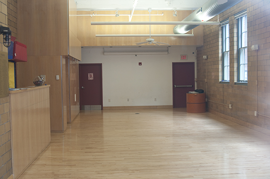 The 1st Floor of the Boston Firehouse on 5/15/2010. An industrial kitchen is located at the rear of the Firehouse and the spiral staircase has been removed. This picture was taken through the windows of the Garage Door.