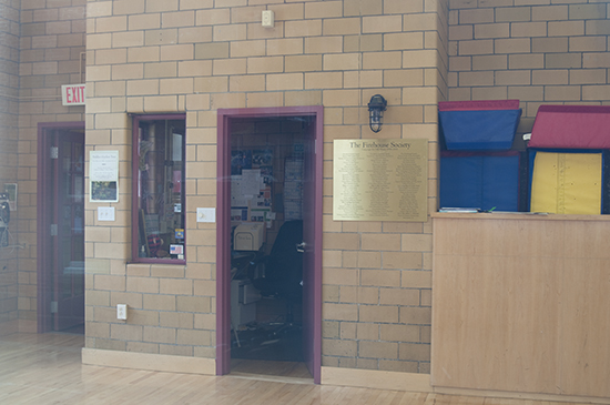 The view of the Phone Room and the Front Door taken through the windows on the River Street Side of the Firehouse.