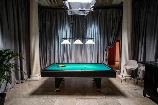"The pool table sits in a windowless space, which is probably why the tall, blank walls were covered with draperies in '92 - another motif, along with the similar pendant lights over the pool table, that was picked up for the reboot." (www.curbed.com)