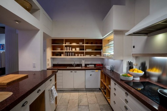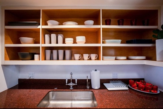 "The entire loft has been remodeled since 1992, which you can see most clearly in the kitchen. It now has updated countertops, open shelving, and a higher ceiling. The fridge is differently stocked too. "We definitely catered to a more grown-up crowd," James McGowan said." (www.curbed.com)