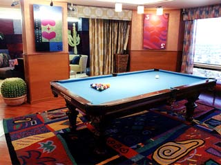 The Billiard Room in the Palms Suite is located across from the Kitchen and between the Living Room and Lounge. In this picture, you can see the Living Room in the background.