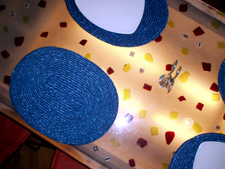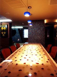 The Kitchen table is decorated with inlaid pieces of colored class and Palms dice. The original idea was to include playing cards and poker chips in the table, but it is illegal to bring your own cards and chips into a casino.
