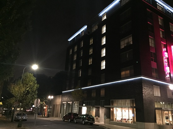 The NW Flanders Street Side of the Hampton Inn & Suites on 10/17/2017. This picture was taken from the corner of NW Flanders Street and NW 9th Avenue.